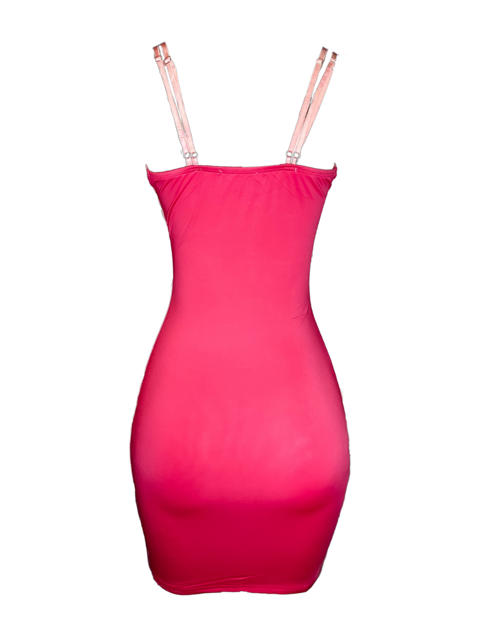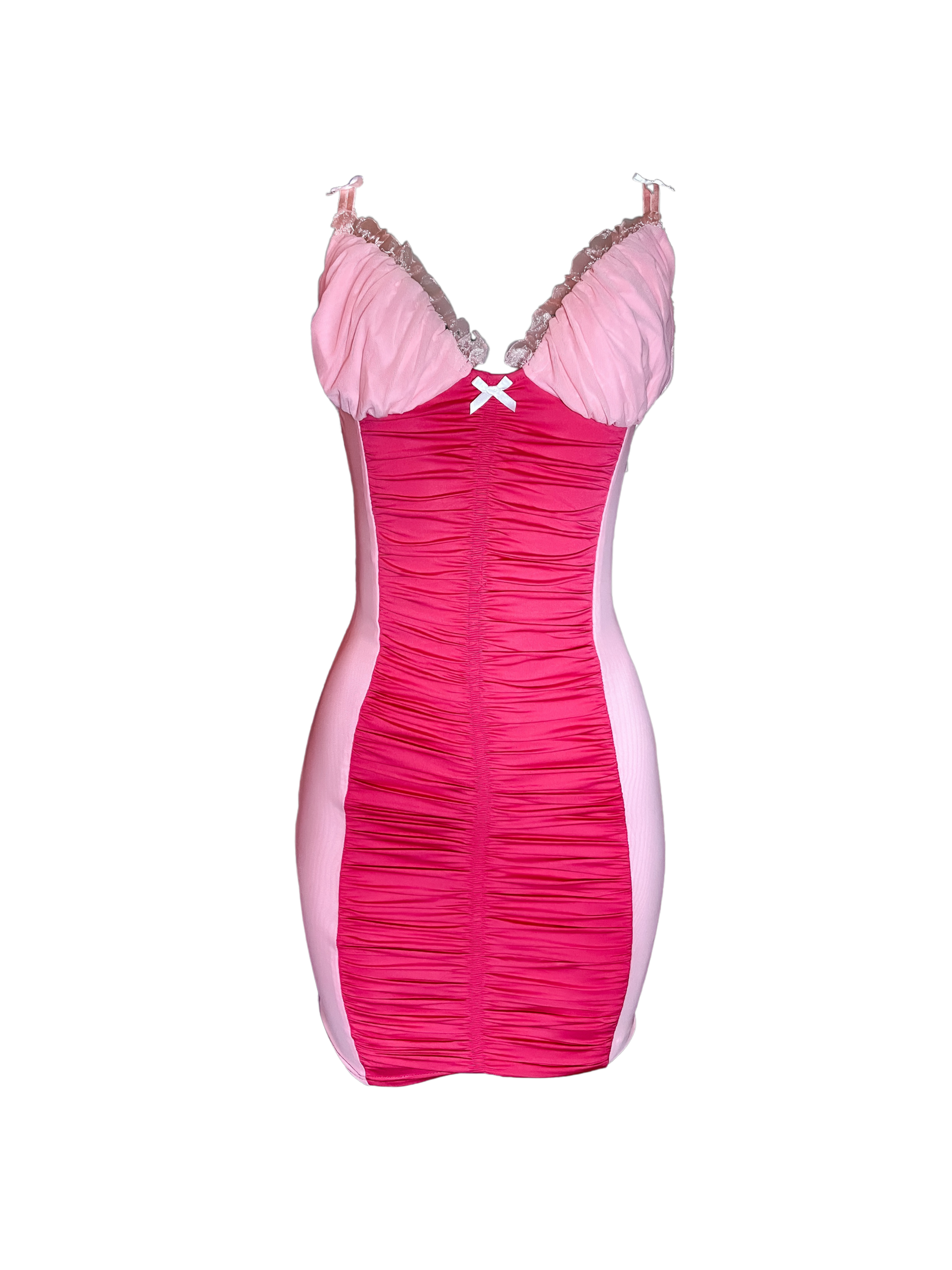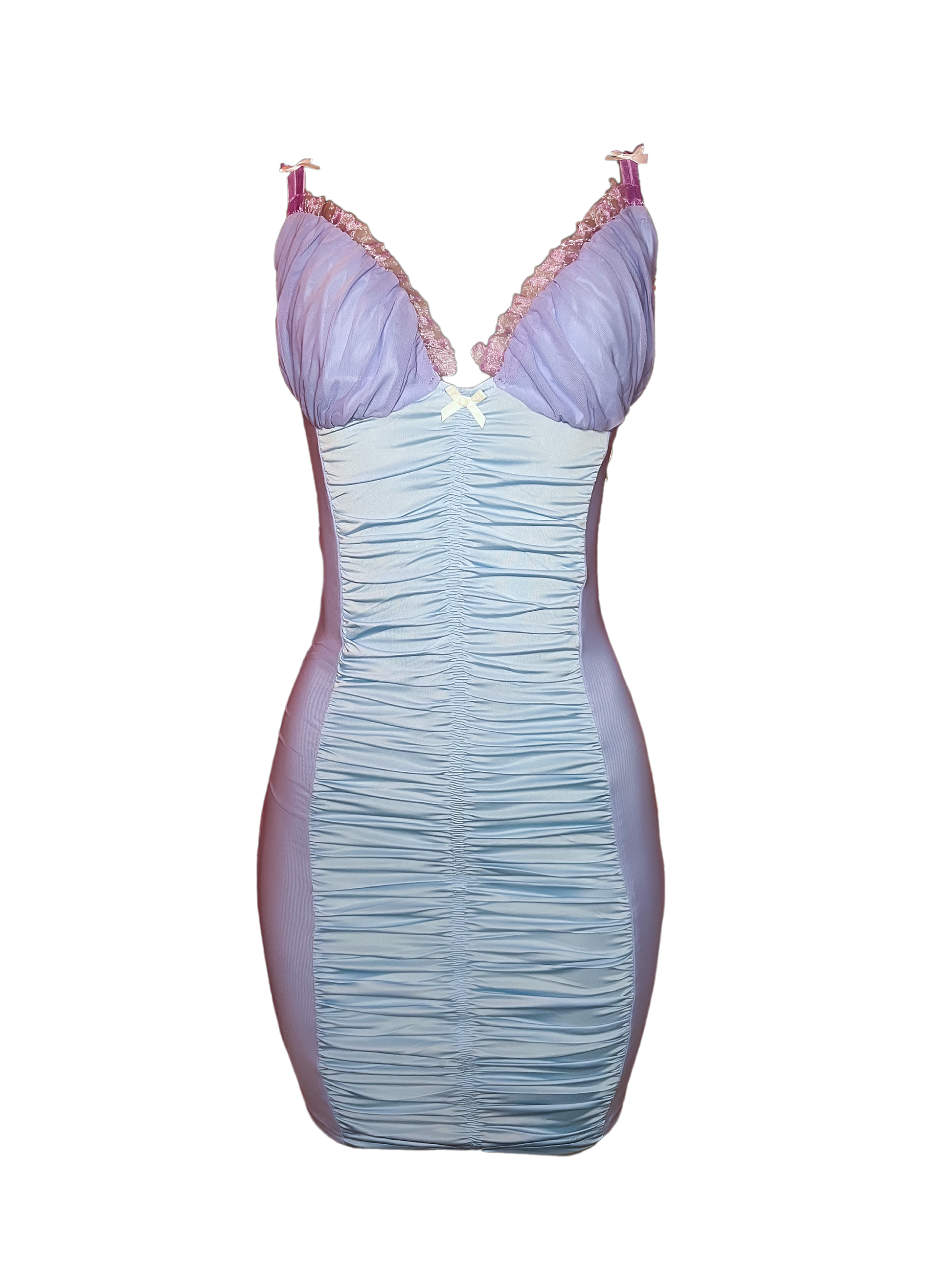 Dreamy two tone babydoll bodycon mini dress with shimmery mesh trim bust, double adjustable straps and adorable bows.