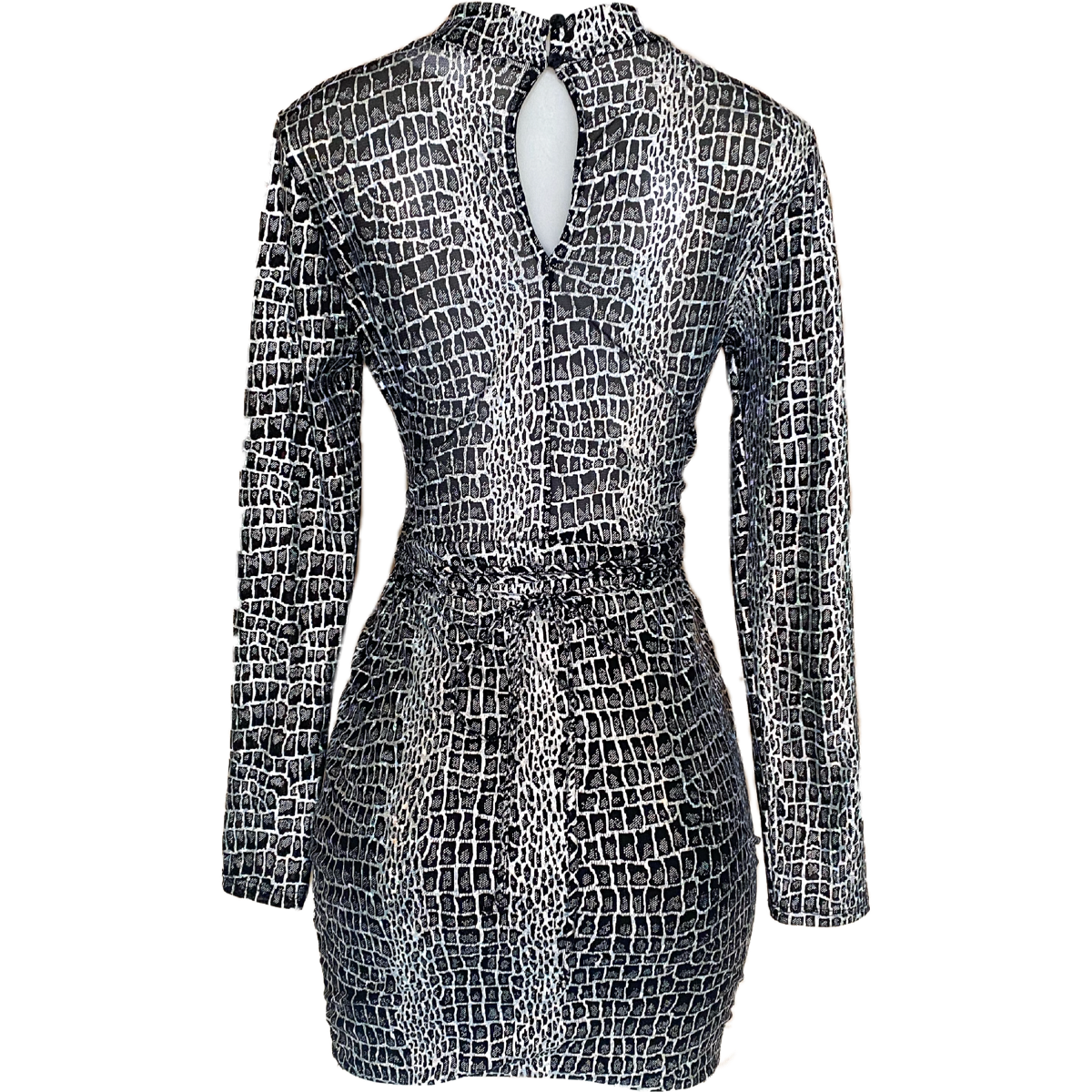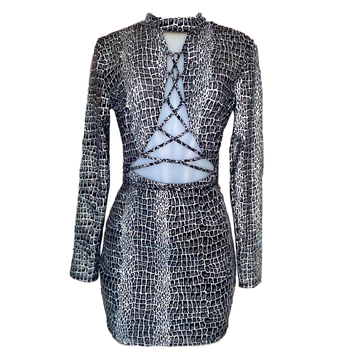 Black and Silver Long-sleeve Alligator Print Mini Dress with a Mock Neck and Shimmering Rainbow Holographic Color Shift. Has a Sexy Strappy Frontal with Strings That Can Be Altered and Adjusted to Your Own Preference. Oval Back with Multi Elastic Button Neck Closure.