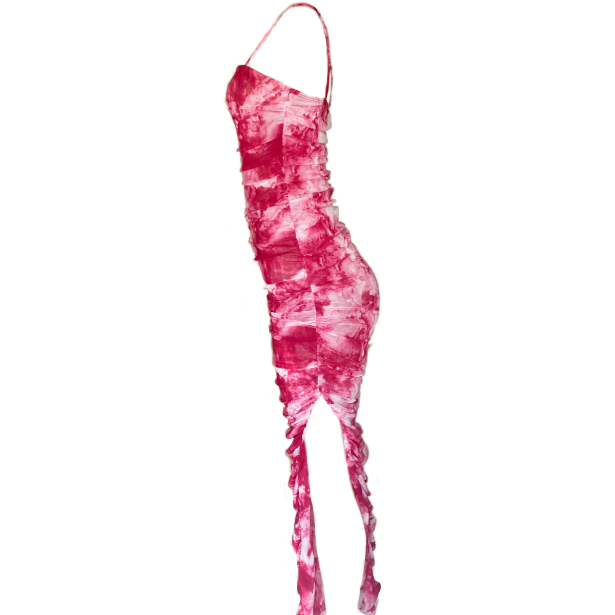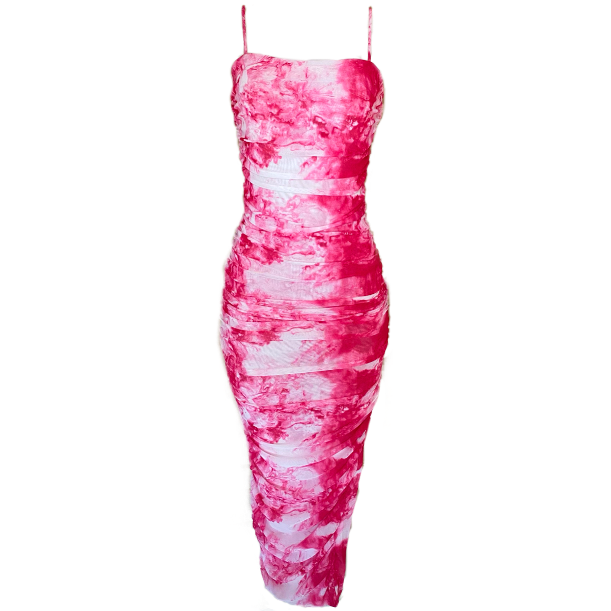 Flaming Pink Tie Dye Maxi Dress with a Mesh Overlay, Rutched Hips and Open Leg Slit.