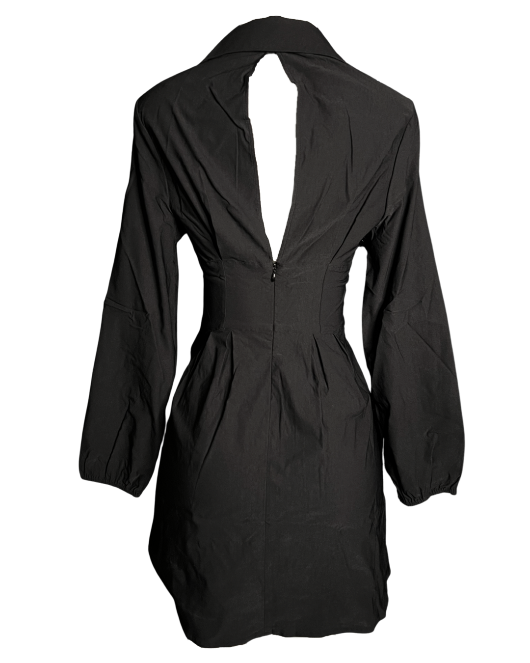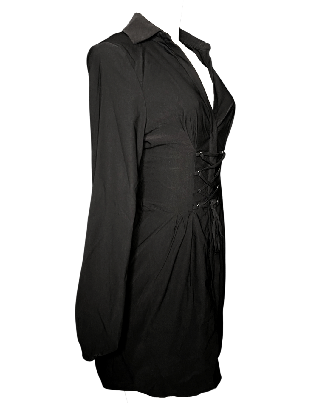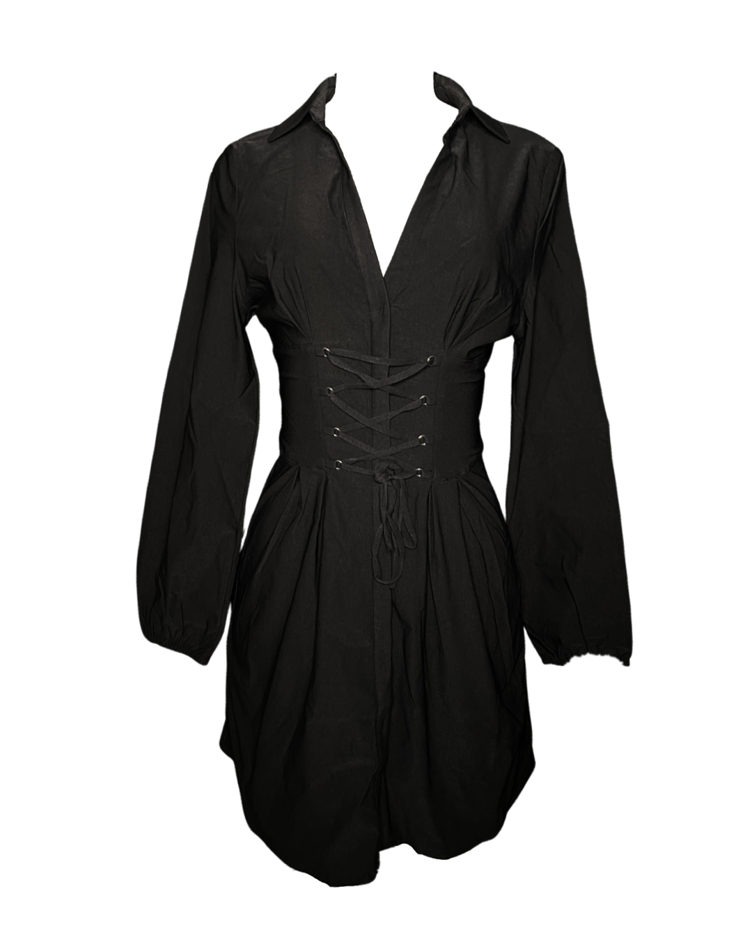 Sophisticated woven collared mini dress with lace up corset-like detail that is adjustable and self tied to your own comfort! Gives the waist a lovely figure. Has an upper open back detail and zip up/single clasp closure.