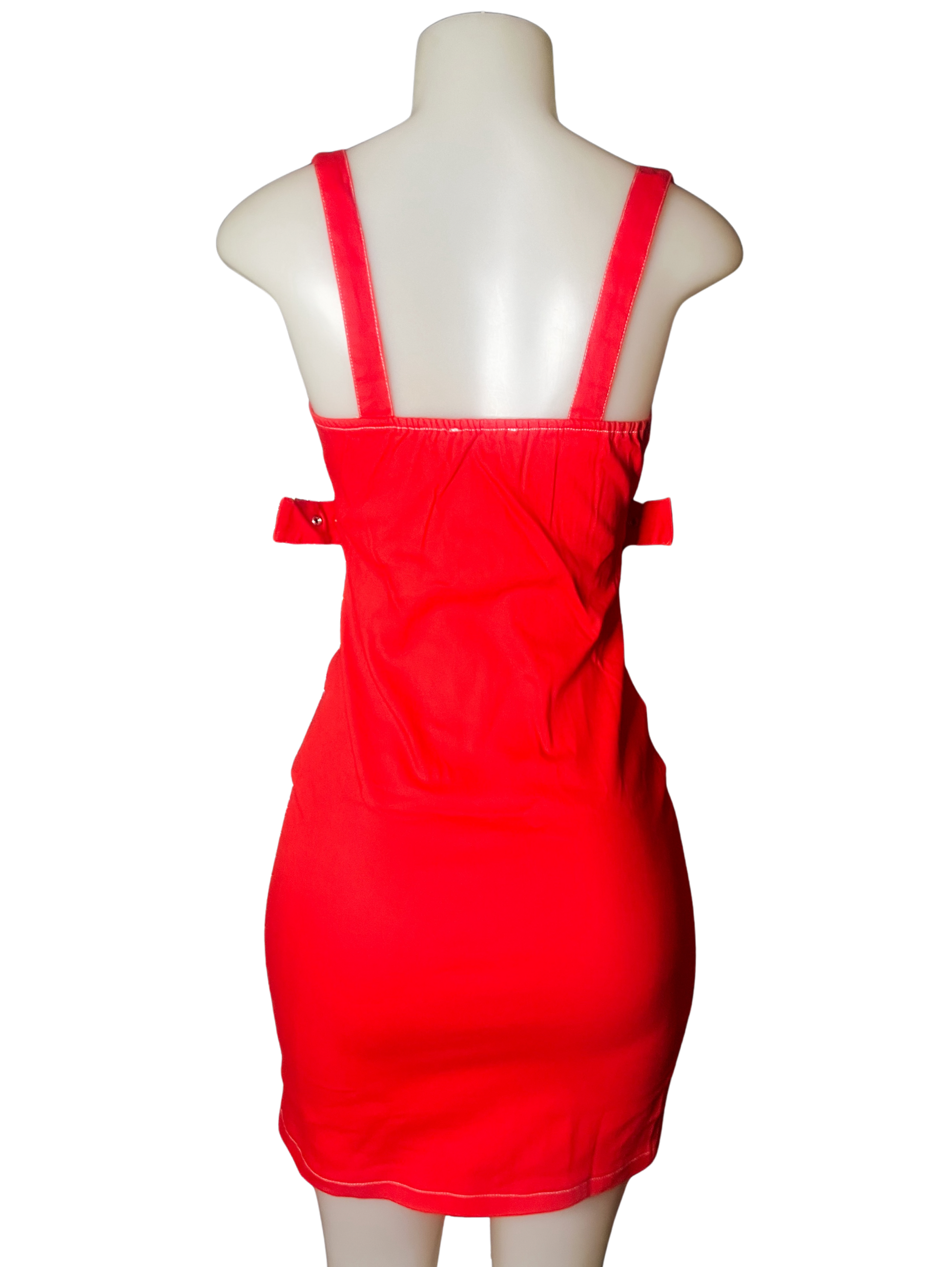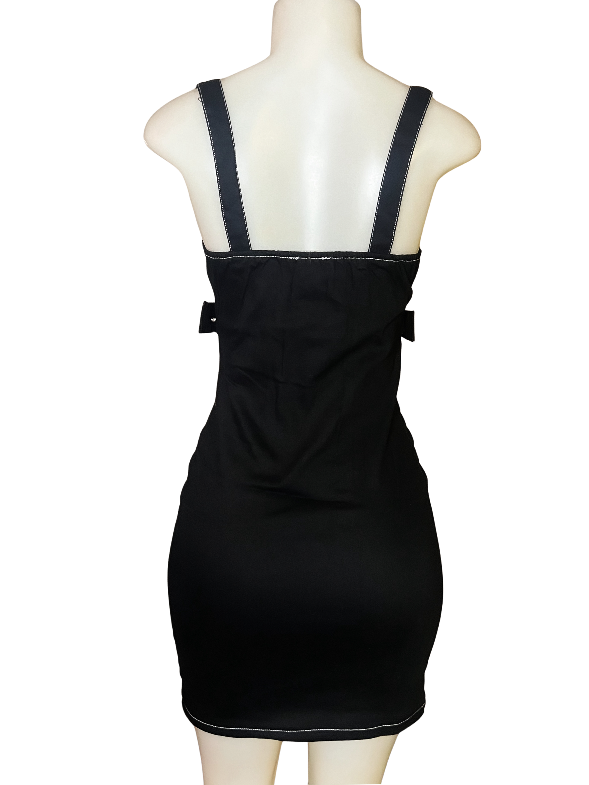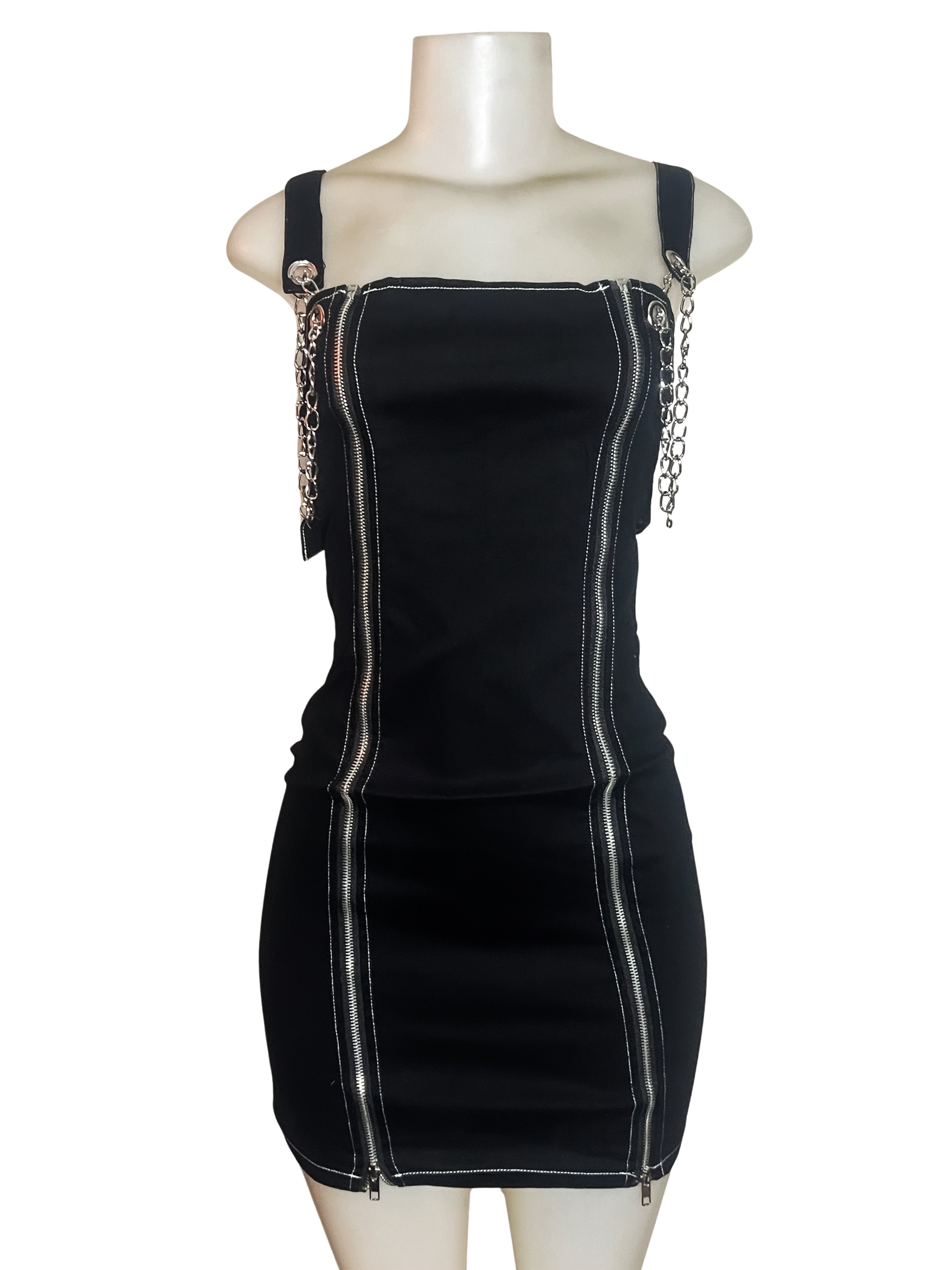 Bodycon mini dress with adjustable hooked chain straps, grommet waist belt, and full body zip up zippers to alter the dress to your desired fit.